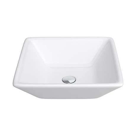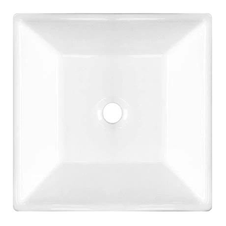 Basin features a stylish square base with sloping edges and comes with no tap holes. Designed to be used alongside a counter or wall mounted outlet.