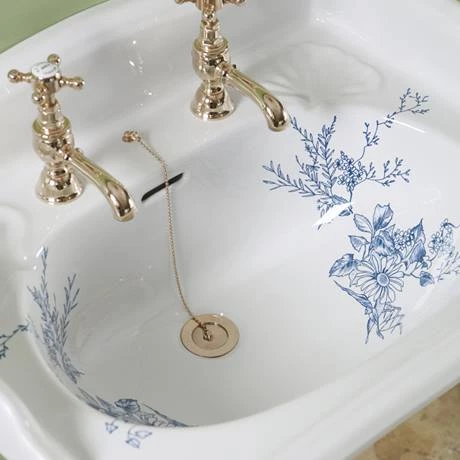 A beautifully traditional Victorian blue garden pattern 635mm wide basin with unfluted standard height pedestal, hand crafted by Silverdale Bathrooms from the finest china clay. Featuring a elegant blue garden pattern which has been fired into the glaze and classic square forms with distinctive high splash backs. Each individual piece of sanitary ware has been carefully considered in its design, being based on authentic original pieces and lovingly re-created.