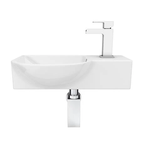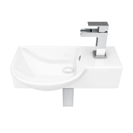 The space-saving Valencia mini gloss white compact wall hung basin, a high quality offset ceramic basin with a single tap hole positioned on the right hand side. Provides you with a handy space-saving solution for your cloakroom or en-suite.