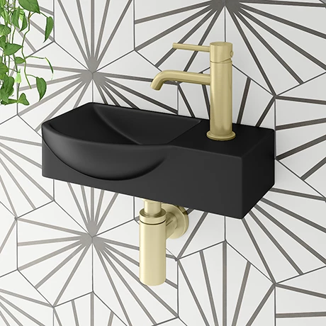 The space-saving Valencia mini matt black wall hung basin, a high quality offset ceramic basin with a single tap hole positioned on the right hand side. Provides you with a handy space-saving solution for your cloakroom or en-suite.